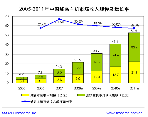 报告数据显示,2007年中国域名主机行业收入规模为14.3亿元,比2006年增长了81.5%,其中域名市场收入规模(包括域名注册和续费等)为6.3亿元,虚拟主机市场收入规模为8亿元人民币,艾瑞咨询预计到2011年中国域名主机行业的收入规模将超过50亿元,可见未来中国域名主机行业的发展存在巨大的潜力。艾瑞咨询认为虽然域名主机行业不如搜索引擎、即时通讯、网络视频、网上银行、电子商务那样受到人们的关注,但其为国家信息化建设以及国民经济做出的贡献不容小觑。