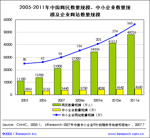 截止2007年,中国网民的数量规模为2.1亿人,艾瑞咨询预计到2011年中国网民的数量规模将达到4.8亿人,中小企业也必将意识到建立企业网站,进行网络营销的重要性,预示着中国未来网络营销良好的发展前景。艾瑞咨询预计到2011年中国中小企业的数量将达到4660万,其中拥有企业网站的企业数量将达到363万家,作为提供网站建设基础的域名主机服务的运营商必将是企业信息化建设的直接推动者和受益者。