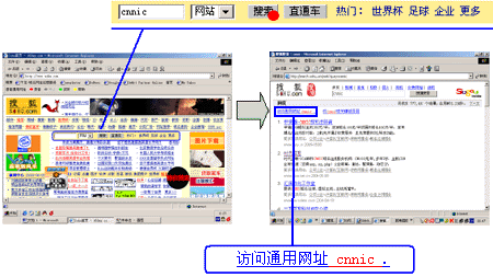 在搜狐的网站搜索中输入通用网址,点击"搜索"按钮,在结果页面出现通用网址文字链标志,点击后可以进入相关网站