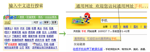 在新浪的网站搜索中输入通用网址,点击"搜索"按钮,在结果页面出现通用网址文字链标志,点击后可以进入相关网站。